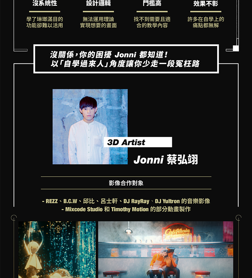 来自3D艺术家Jonni的课程,Jonni 是一位电脑动画创作者,看他的 Instagram 和 Facebook,让人想起动漫电玩和美国画家 Edward Hopper。而他的学习过程也很有趣,毕业自中山大学企管系,随后跨界到台艺大视觉传达研究所取得硕士学位。毕业三年多来,他的名字已在业界备受肯定,并获邀参与多项设计,包括金钟奖的动画设计。